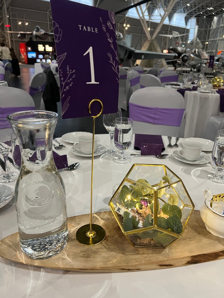 Set against the soaring backdrop of the Aviation Museum, Cathryne & Andrew celebrated their love with a wedding as unique as their story. Their day blended modern elegance with a touch of whimsy, where rich purples and subtle geometric accents added a contemporary edge to the space. Guests dined and danced among historic aircraft, creating an unforgettable atmosphere that felt both romantic and extraordinary.